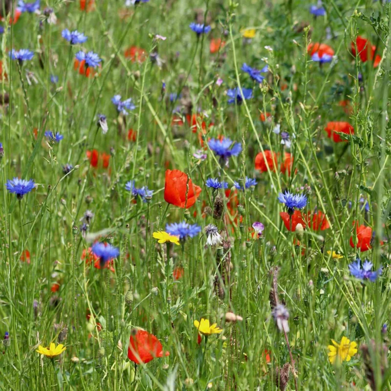 Schafgarbe, Sommer-Adonisröschen, Heckenzwiebel, Färberkamille, Boretsch, Ringelblume, Acker-Glockenblume, Nickende Kratzdistel, Kornblumen, Wiesen-Flockenblumen, Meerviole, Saat-Wucherblume, Wegwarte, Mandelröschen, Steppen-Rittersporn, Buschwinden, Mädchenauge, Koriander, Schmuckkörbchen, Gelbes Schmuckkörbchen, Chinesische Hundszunge, Wilde Möhre, Kapkörbchen, Moldawische Melisse, Natternkopf, Schlafmützchen, Buchweizen, Nadelkissen-Gilie, Dreifarbige Gilie, Atlasblume, Sommer-Schleierkraut, Teppich-Schleierkraut, Sonnenblume, Sonnenflügel, Johanniskraut, Schleifenblume, Färber-Waid, Acker-Witwenblume, Margerite, Herbst-Löwenzahn, Leinkraut, Steppen-Lein, Roter Lein, Ausdauernder Lein, Leinkraut, Hornklee, Moschusmalve, Wilde Malve, Gelbklee, Luzerne, weißer Steinklee, gelber Steinklee, Hainblume, Gefleckte Hainblume, Jungfer im Grünen, Esparsette, Wilder Majoran, Veränderlicher Mohn, Klatschmohn, Seidenmohn, Pastinak, Blauglöckchen, Rainfarn-Phazelie, Spitzwegerich, Hederich, Gelber Wau, Färber Resede, Duftresede, Wiesen-Salbei, Kleiner Wieseknopf, Kuhkraut, Leimkraut, Rote Lichtnelke, Weiße Lichtnelke, Gelbsenf, Ackersenf, Gemeine Goldrute, Rainfarm, Inkanatklee, großblütige Königskerze, Schwarze Königskerze, Himmelsröschen, Saatwicke