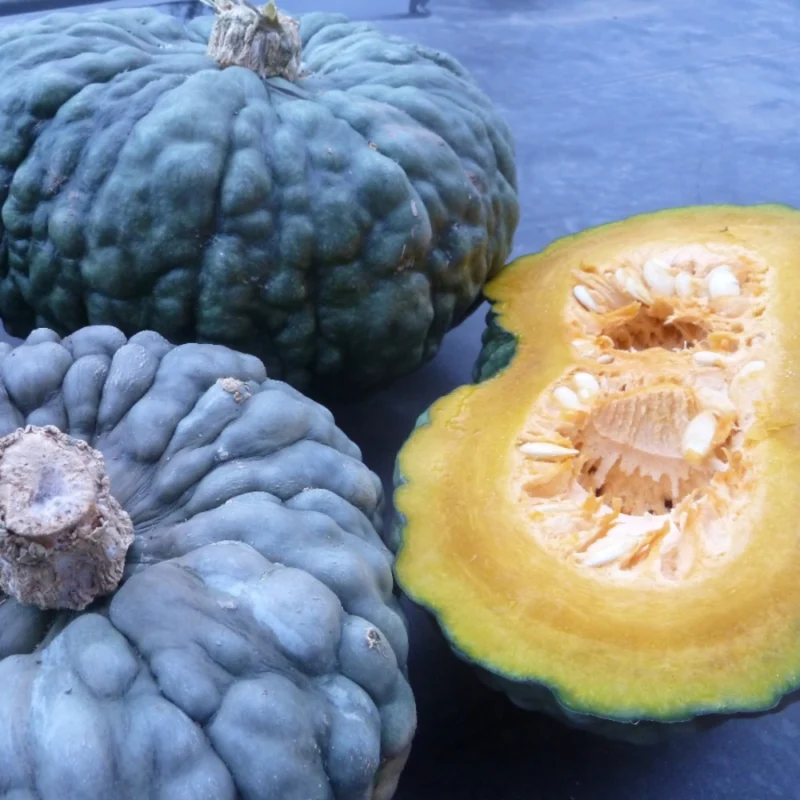 Der Kürbis ‘Marina’ ist eine alte italienische Kürbissorte mit dekorativer, matt blau-grüner Schale. Die Früchte erreichen ein Gewicht von 4–8 kg und besitzen eine stark gefurchte, auffällig gewarzte und essbare Schale – typisch für diesen traditionellen Speisekürbis.