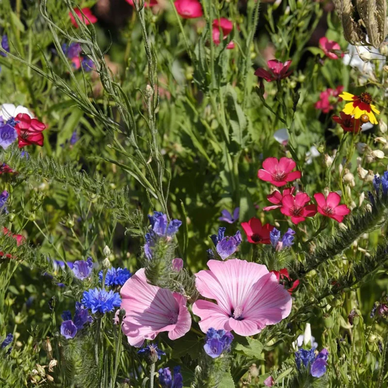 Schafgarbe, Sommer-Adonisröschen, Färberkamille, Acker-Glockenblume, Nickende Kratzdistel, Kornblumen, Wiesen-Flockenblumen, Meerviole, Saat-Wucherblume, Wegwarte, Mandelröschen, Steppen-Rittersporn, Buschwinden, Mädchenauge, Schmuckkörbchen, Gelbes Schmuckkörbchen, Chinesische Hundszunge, Wilde Möhre, Kapkörbchen, Moldawische Melisse, Natternkopf, Schlafmützchen, Buchweizen, Dreifarbige Gilie, Atlasblume, Sommer-Schleierkraut, Sonnenflügel, Johanniskraut, Schleifenblume, Färber-Waid, Acker-Witwenblume, Margerite, Herbst-Löwenzahn, Leinkraut, Steppen-Lein, Ausdauernder Lein, Hornklee, Wilde Malve, Gelbklee, Luzerne, weißer Steinklee, gelber Steinklee, Hainblume, Jungfer im Grünen, Esparsette, Wilder Majoran, Veränderlicher Mohn, Klatschmohn, Pastinak, Blauglöckchen, Spitzwegerich, Gelber Wau, Wiesen-Salbei, Kleiner Wieseknopf, Kuhkraut, Rote Lichtnelke, Gemeine Goldrute, Rainfarm, Inkanatklee, Himmelsröschen
